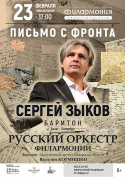 Сергей Зыков, баритон (Санкт-Петербург) – лауреат многочисленных всероссийских и международных конкурсов. Выпускник Академии оперных певцов Мариинского театра, ярко проявивший себя как на оперной, так и на филармонической сценах. Сергей Зыков – исполнитель романсов, военных, народных и казачьих песен, которого называют «голосом русского сердца», чей проникновенный баритон покоряет слушателей раз и навсегда. Отдельную главу в творчестве певца занимает военная тема. Он с особым духом, мастерством и удалью исполняет как песни времен Великой Отечественной войны, так и советские песни, посвященные армии, солдатам, патриотизму.